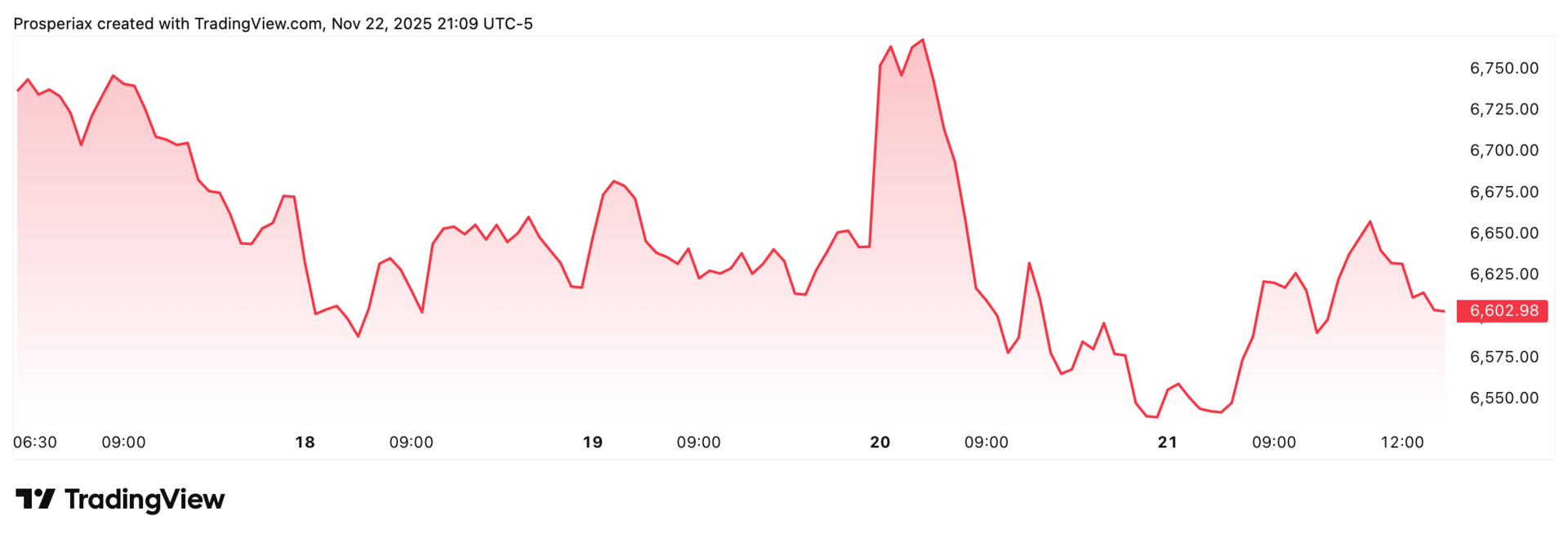 The S&P 500 dropped roughly 2% and the Nasdaq sank about 2.7%, as rising yields, macro jitters, and profit-taking drove a third straight weekly loss for tech-heavy benchmarks. Midweek saw a brief rally on Nvidia’s beat and Fed commentary, but that upside was erased Thursday before a relief bounce into Friday. Stocks wobbled on mixed economic data and sector rotation, while VIX notched its highest close since April.