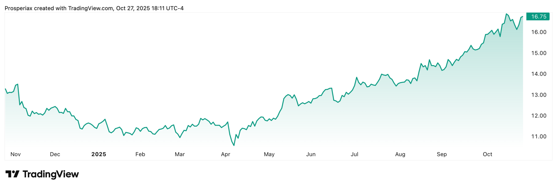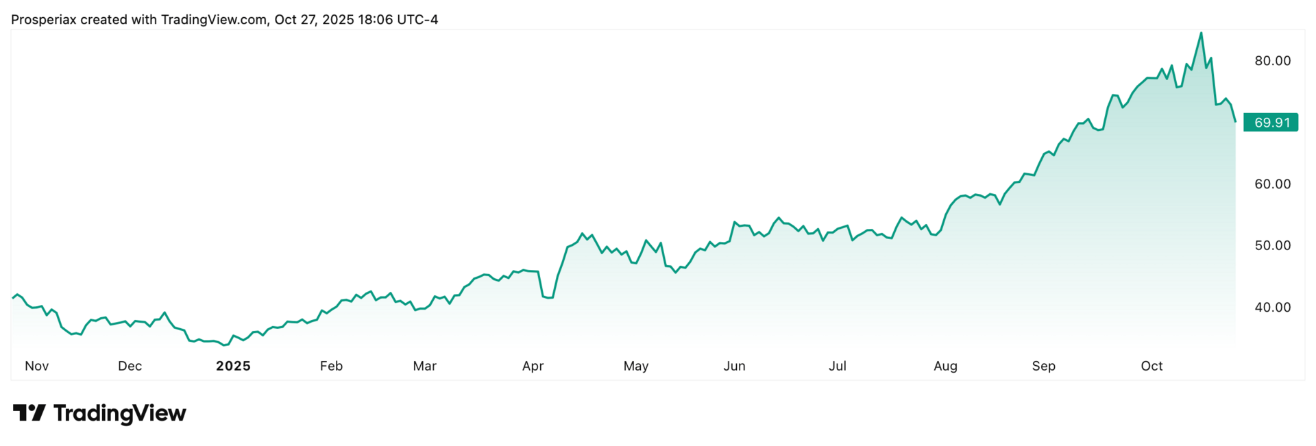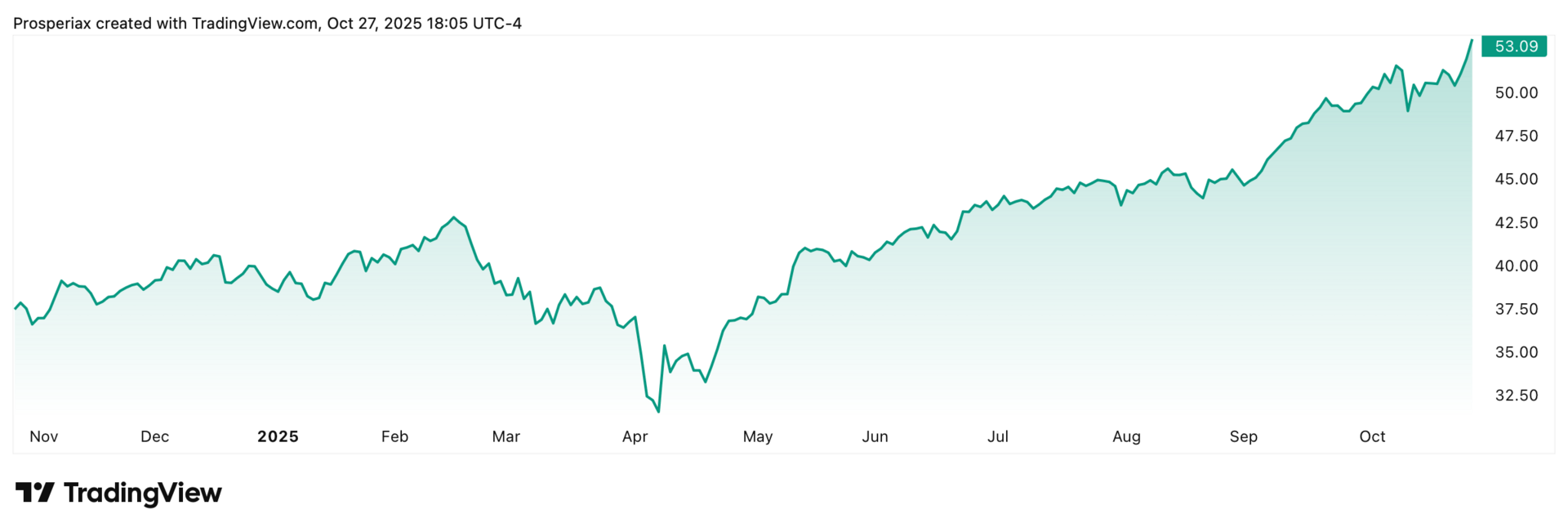 Gold miners often move with leverage to the metal itself. When uncertainty grows or rates ease, their margins expand quickly. With central banks maintaining elevated gold reserves and investors seeking stability amid currency volatility, GDX becomes a strategic signal.